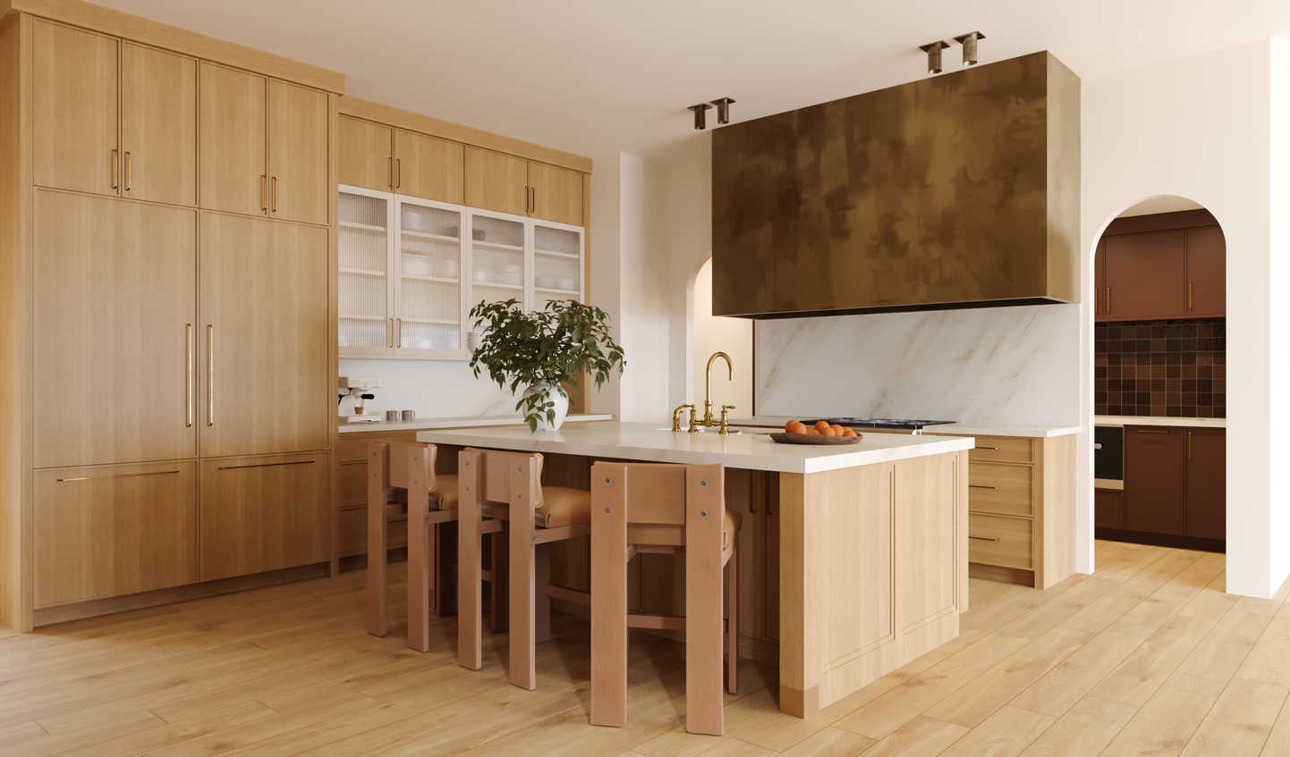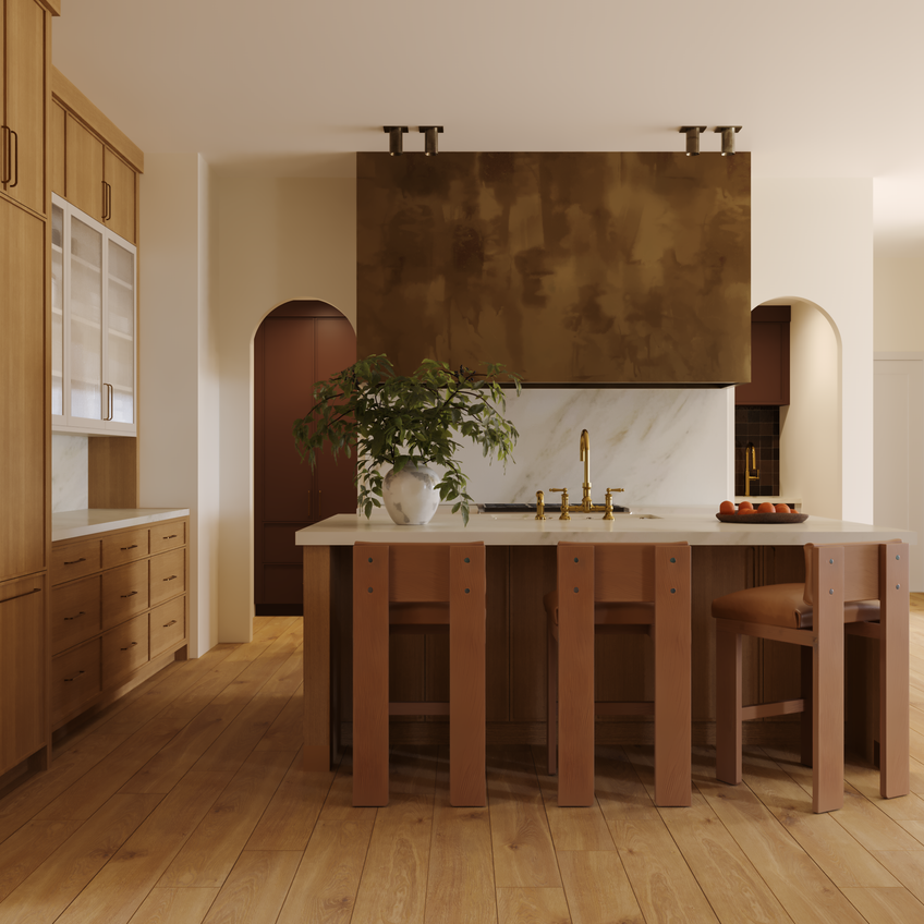 This Mediterranean-inspired luxury kitchen design blends timeless craftsmanship with modern sophistication, perfect for discerning homeowners in Boca Raton, Palm Beach, Naples, and Miami. Warm oak cabinetry pairs with sleek marble countertops and a custom patinated range hood for a striking focal point, while brass fixtures add an elevated touch of quiet luxury. The inviting open layout, rich wood flooring, and sculptural island seating create a balance of elegance and functionality ideal for high-end Florida homes. Whether you’re remodeling a historic Palm Beach estate or building a modern Naples retreat, this kitchen design showcases a refined interior.