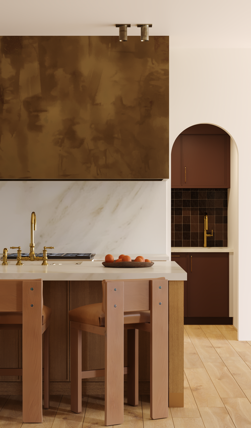 My favorite design element is playing with scale incorporating an oversized hood, downlights, and a bold maroon pantry seen through the flanking arches!